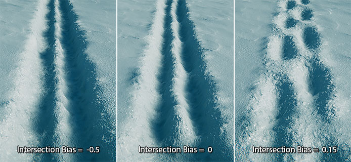 Depth of the trace. If set to 1, the snow within the trace will be pushed down to the surface of the ground. This value also depends on Intersection Bias and Mask Intensity.